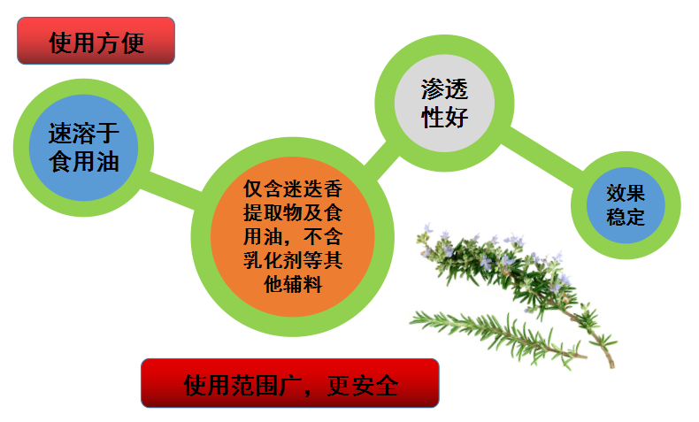 天然来源的迷迭香无毒、气味芳香、抗菌,且抗氧化功效远远高于现有的VC、VE、茶多酚等天然抗氧化剂,是人工合成抗氧化剂BHA、BHT的2到4倍,其结构稳定、不易分解,可耐190℃至240℃高温,彻底克服了VC、茶多酚等大多数天然抗氧化剂遇高温分解这一致命弱点,故相比其他同类产品,它更加高效广谱,独具优势。